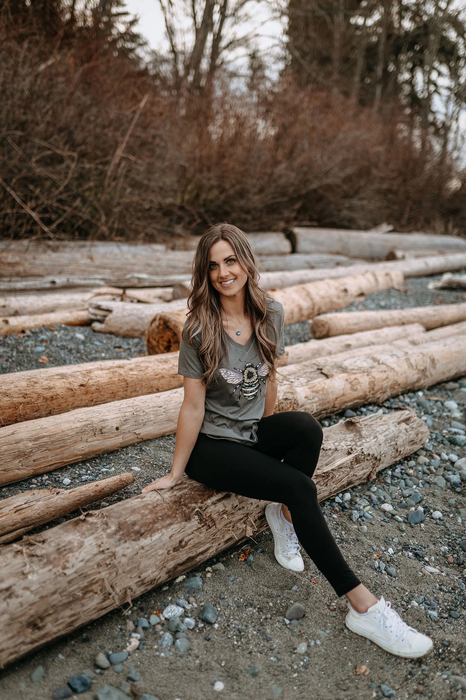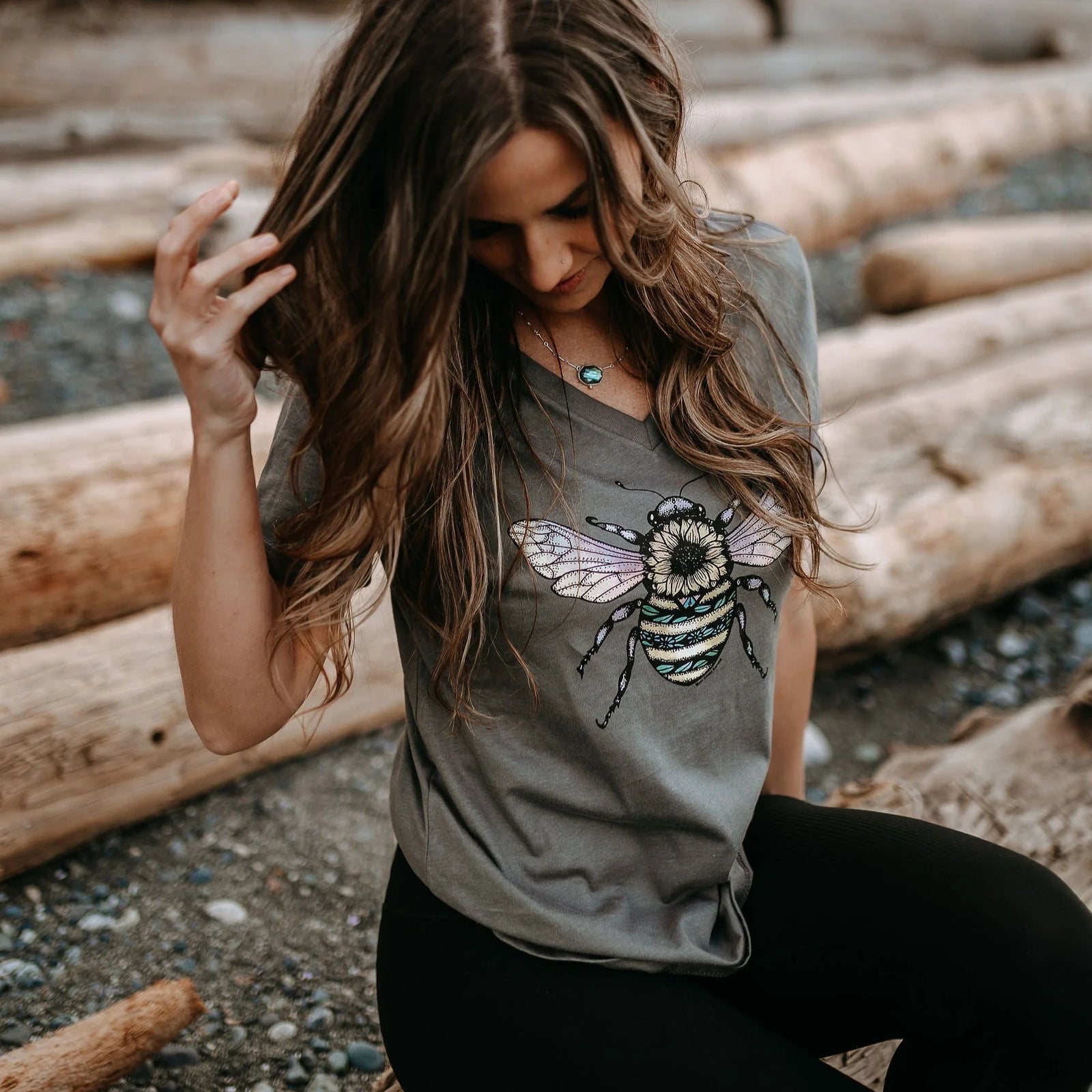 West Coast Karma - Bee Colourful Relaxed V-Neck Tee in Asphalt