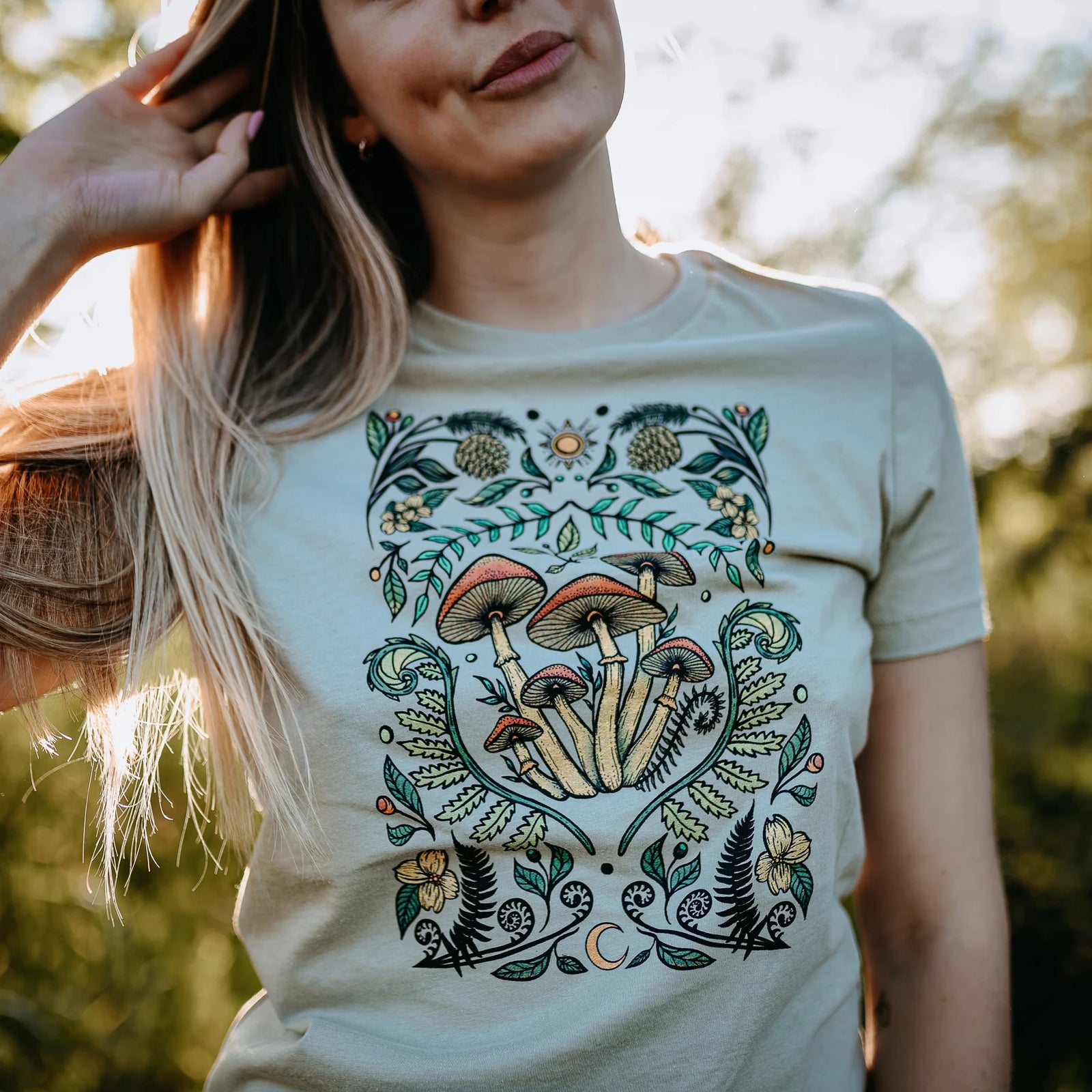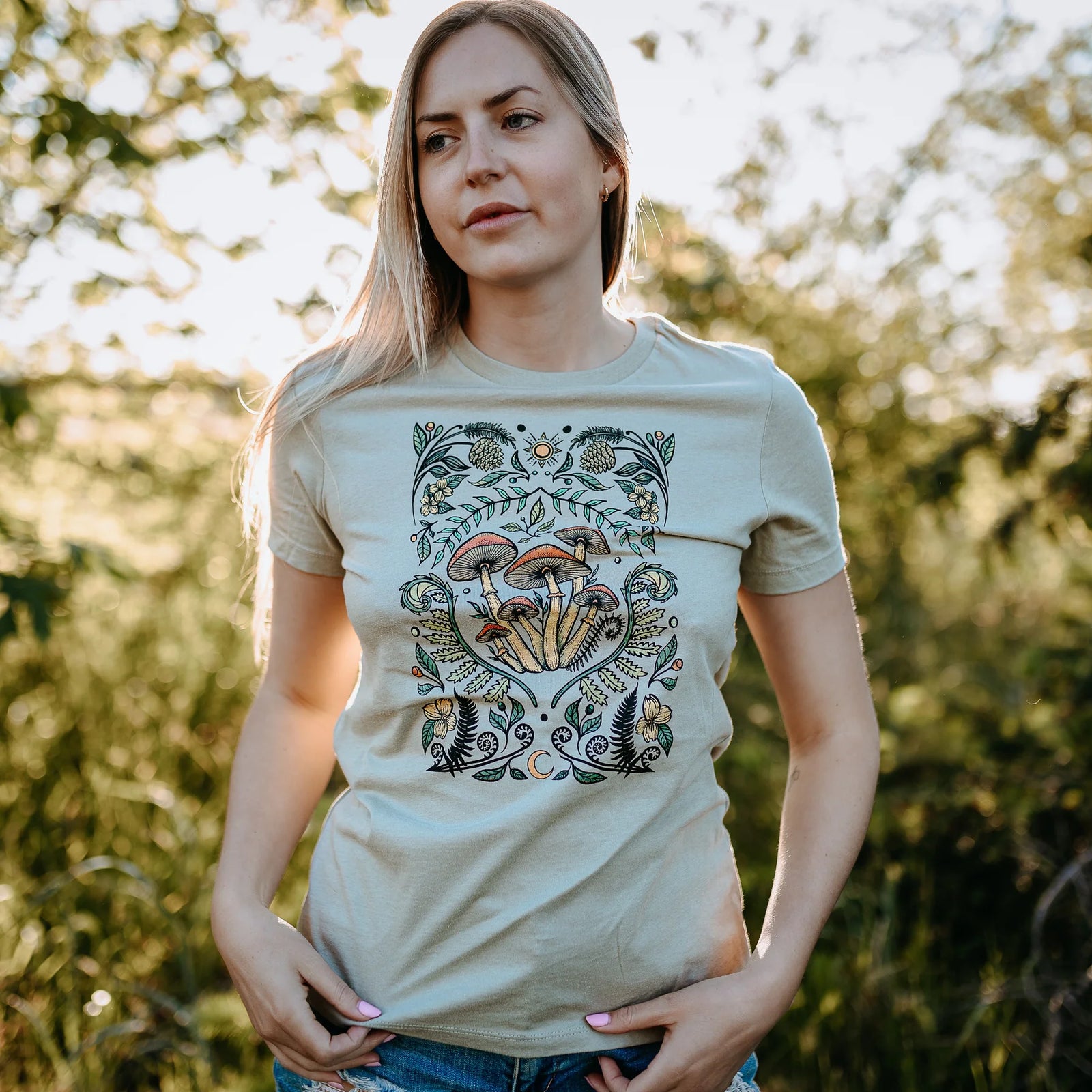 West Coast Karma - Colourful Cottage Mushroom Relaxed Fit Tee in Thyme