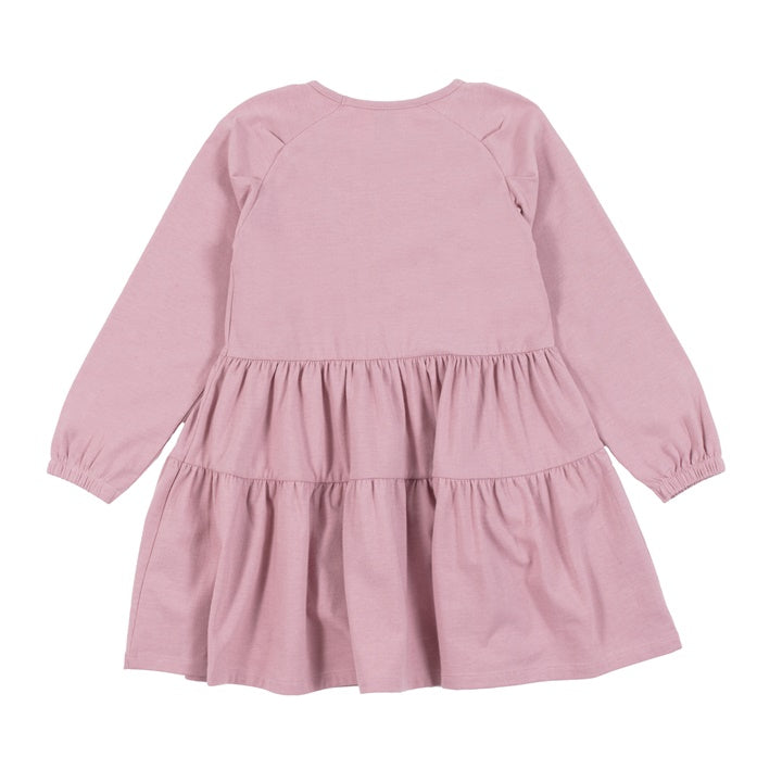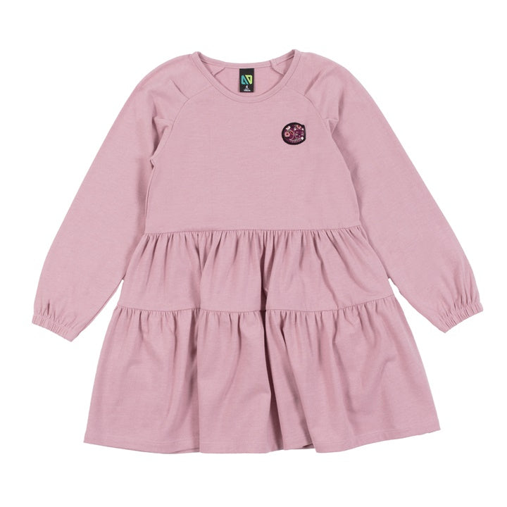 Heathered jersey tunic. Raglan long sleeves. Style with badge on chest and tiered skirt.
