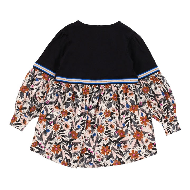 Solid and printed jersey tunic. Long puff-sleeves. Flared style with seaming and decorative band on sleeves and back.